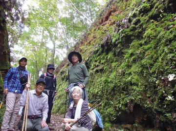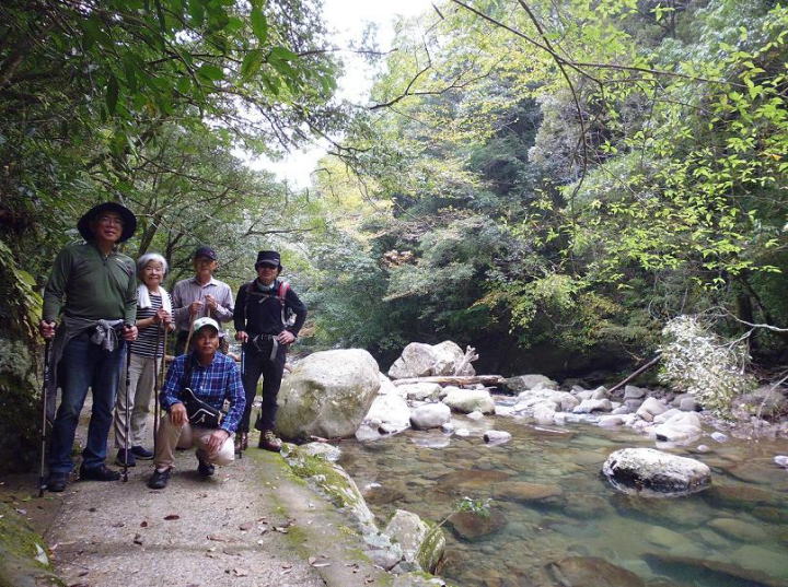 猪八重渓谷散策班は朝9時に佐土原町駅に集合して車1台に男性4名、女性1名でその中に深田喜久男さんが特別参加です。国道220号線海岸沿いが山崩落で通行止めの為、清武から田野線を通り、途中コンビニで昼食の弁当を購入して、猪八重渓谷入口に到着。駐車場で準備体操など行い、11時半に渓谷に向けスタートしました。坂道を上がり川沿いに進み昔の水力発電の貯水槽を経て材木運搬のトロッコレール沿いを歩いたところで河原に下り川石の上に座りで長友まち子さん手製の”むかごおにぎり”を頂きました。休憩を終えしばらく進むと5号橋に到達しましたが、入口に”侵入禁止”の看板があり、1km先の五十滝まではいけませんでした。川沿いの道が台風の大雨で崩れていたからです。そこから約2kmを引返し猪八重渓谷散策を終えました。五十滝は次回にまた挑戦します。